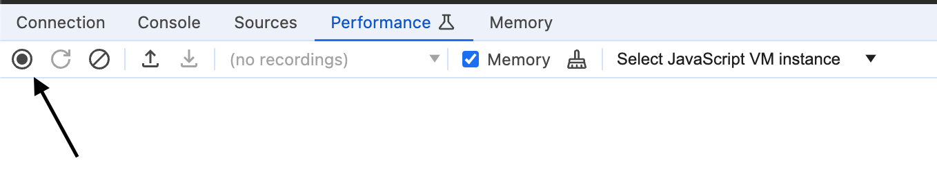 To measure the performance of the connected Node.js app, you go to the Performance tab and click the Record button.