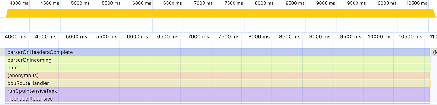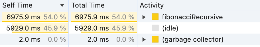 It is clear that the fibonacciRecursive function takes more than half of the execution time. This means that more than half of the time, the application exclusively works for the single function of a single request. This should be optimized.