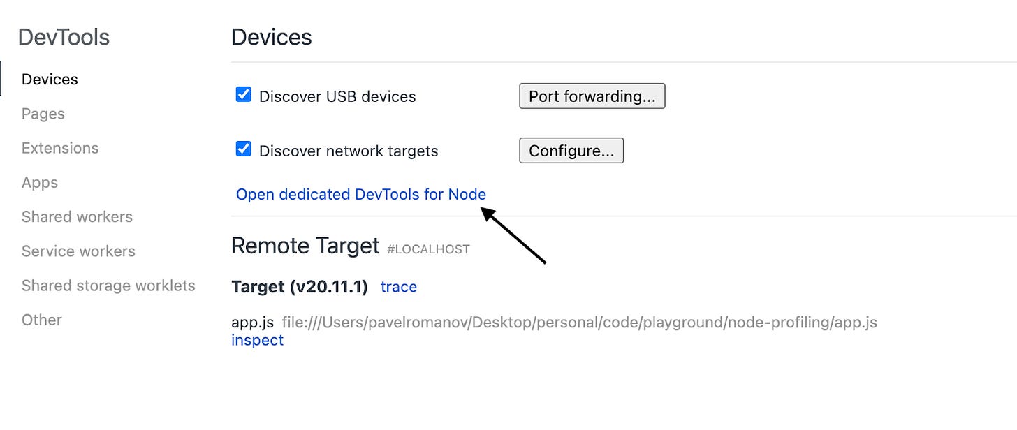 Click the Open dedicated DevTools for Node button. Youll see the DevTools connected to the node process youre running.