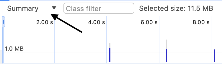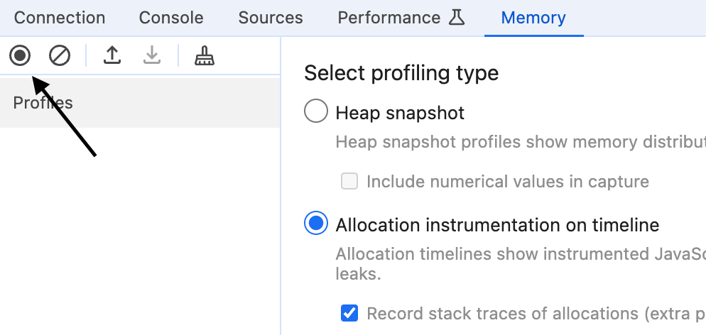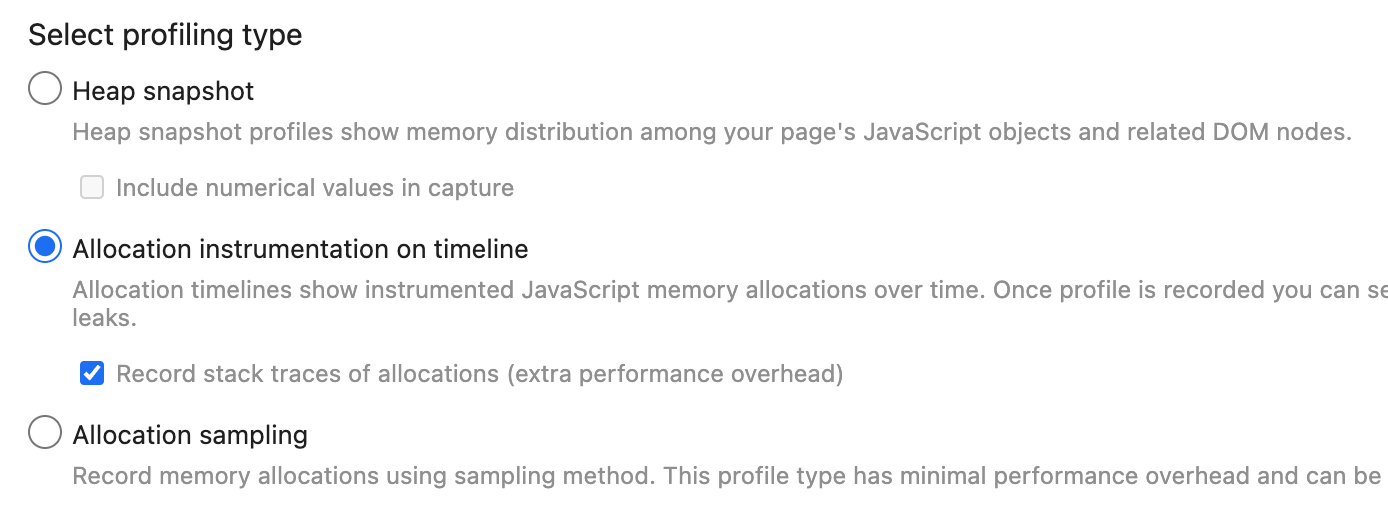 Well choose the second option, Allocation instrumentation on timeline. That way, youll be able to see the memory consumption timeline, which is similar to the performance tab.