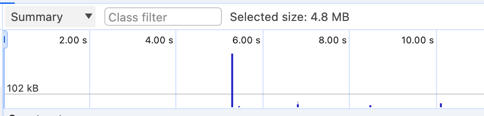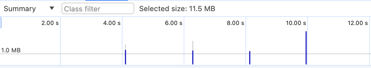 First, well send four requests to the memory leak endpoint with unoptimized implementation and record them using the profiler. You can clearly see four memory spikes on the timeline afterward.