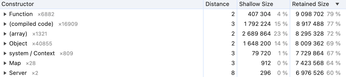 You can barely see requests except for the first one. The overall program size is reduced from 11.6 MB to 4.8 MB. It is ~2.5x less memory consumption.