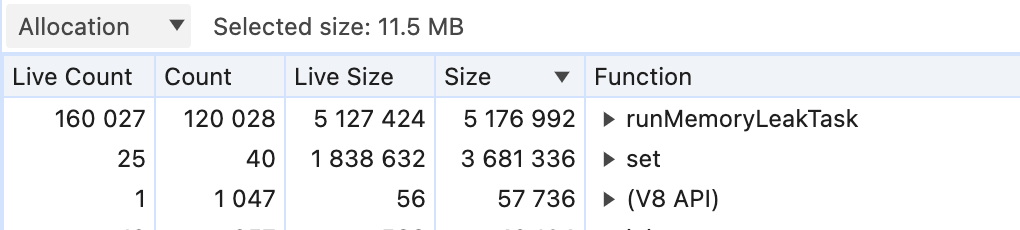 const smartMemoryLeak = new WeakMap();export function runSmartMemoryLeakTask(cb) { for (let i = 0; i < 10000; i++) { const person = { name: `Person number ${i}`, age: i, }; smartMemoryLeak.set(person, `I am a person number ${i}`); } cb();}All previous measurements were made using the performance tab inside DevTools. The memory tab also allows us to measure memory consumption.