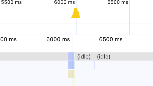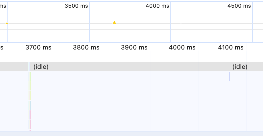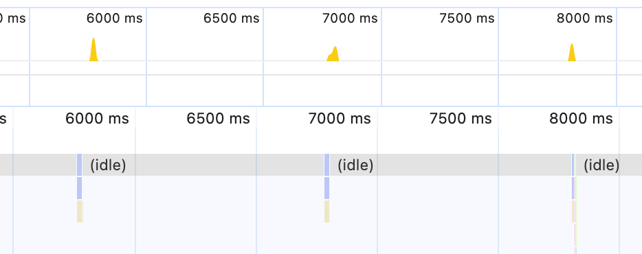 function generateAsyncOperation() { return new Promise(resolve => { setTimeout(() => { for (let i = 0; i < 50000000; i++) { } resolve(); }, 1000); });}export async function runSmartAsyncTask(cb) { await Promise.all( new Array(3).fill().map(() => generateAsyncOperation()) ); cb();}The result of the waterfall async function is that you see three spikes with intervals around 1000ms or one second. This means a function runs only after the previous one has finished running.