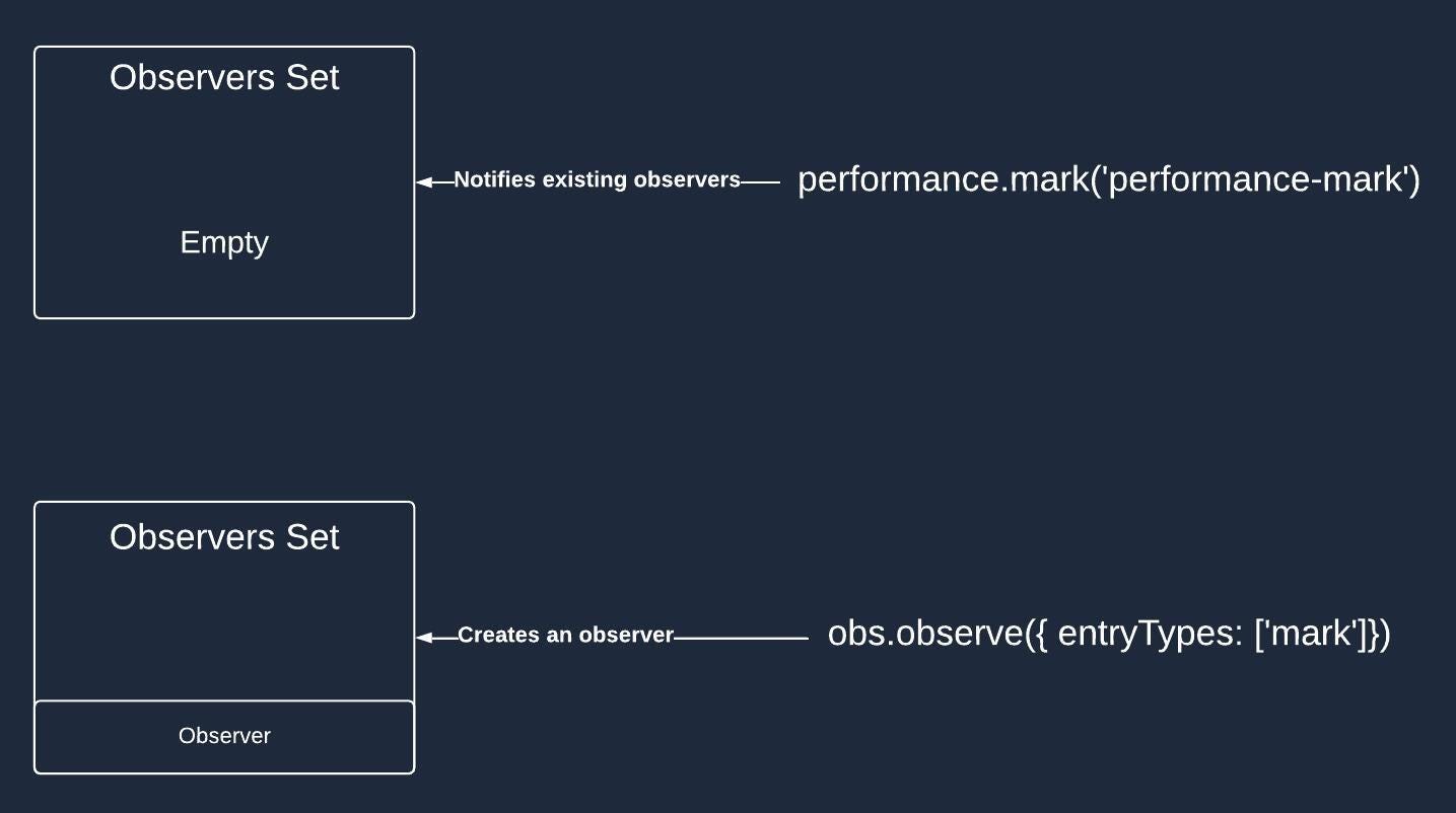 The observers callback is triggered whenever a new performance entry is created. In our case, performance.mark('performance-mark') creates the Mark performance entry and calls all existing observers interested in this type of performance entry.